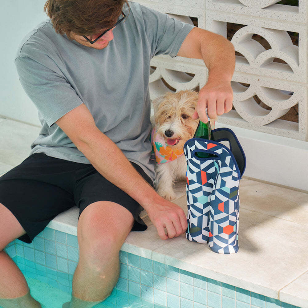 Head off to a barbeque in style with the neoprene double wine bottle bag. Available in 6 new designs. Handy to transport soft beverages to a sporting match too. Makes a great housewarming gift! 24cmW x 38cmH Materials: Neoprene