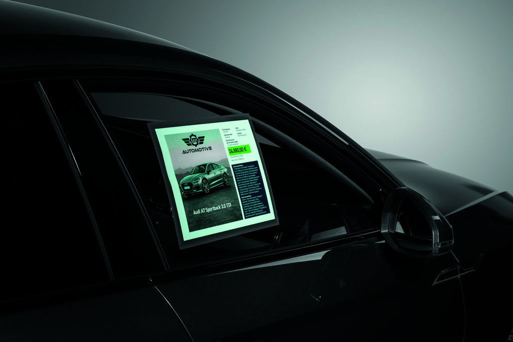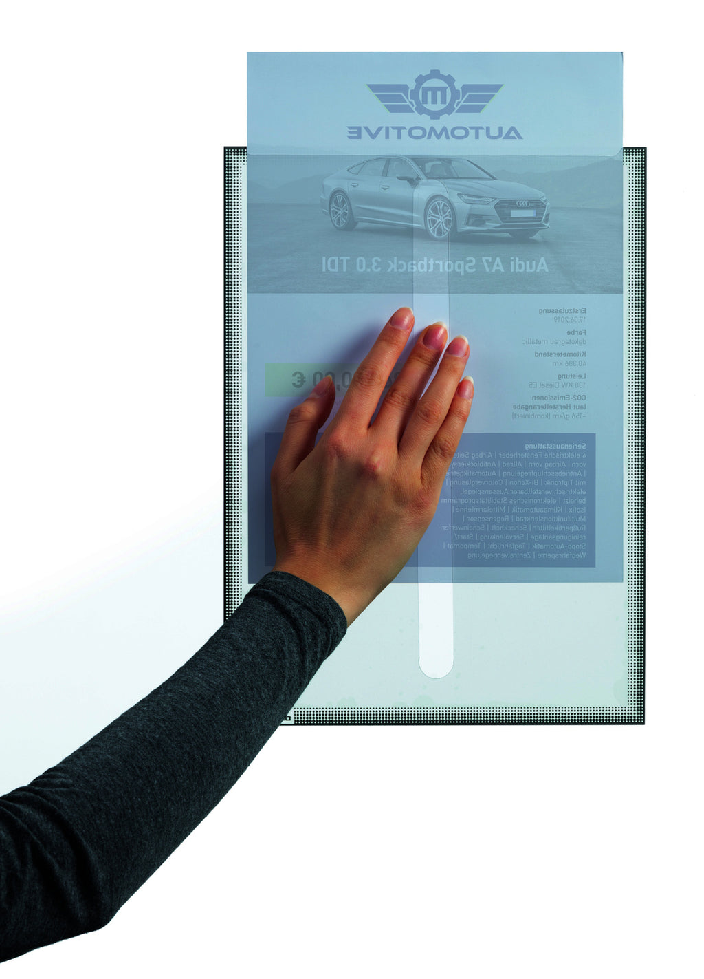 DURAFRAME® INFO FRAME STATIC CLING - The professional way to display signs without the use of adhesives. Easily attaches to the interior of glass surfaces, including those that are curved such as car windows, shop windows and sales counters..
