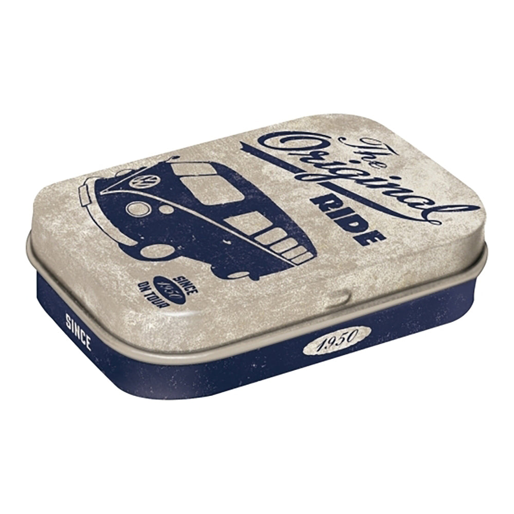 A metal mint box filled with quality German made mints. The small sized box fits conveniently into your pocket or bag. The mint box is made from steel sheet metal with an embossed design on the lid.
