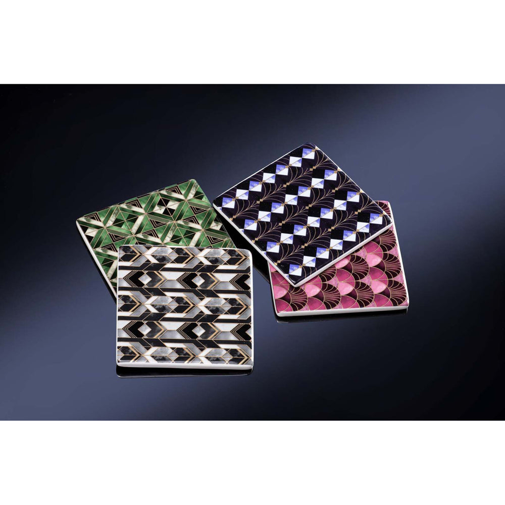 Set of 4 Decadence Coasters. Made with a quality cork backing with a gloss hardboard finish. Keeps your surfaces free of liquid marks and heat damage. Comes in gift box packaging. Wipe clean only