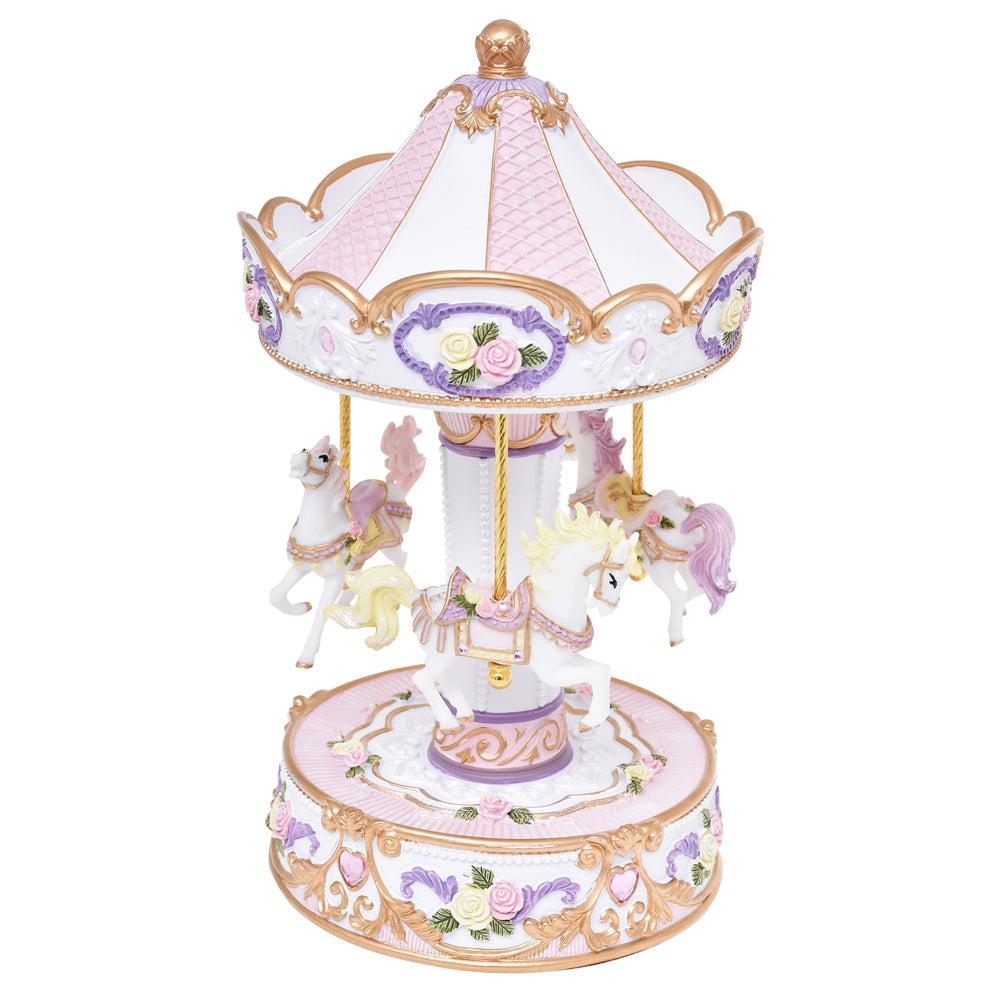 Step into a world of whimsical charm with our exquisite Ornamental classic musical Carousel. Designed to captivate both young and old, this beautifully crafted piece features three elegant white horses, each adorned with intricate details that bring them to life. The horses ride gracefully upon gleaming gold poles, adding a touch of opulence to the carousel’s enchanting design. The carousel itself is a dreamy shades of white ,pink and mauve , evoking a sense of calm and nostalgia. Accentuated with pink and lemon flowers, this piece offers a delightful pop of colour that catches the eye. Completing the aesthetic are heart gems and gold highlights that make this carousel a true centrepiece of beauty. Melody minuet Mozart
