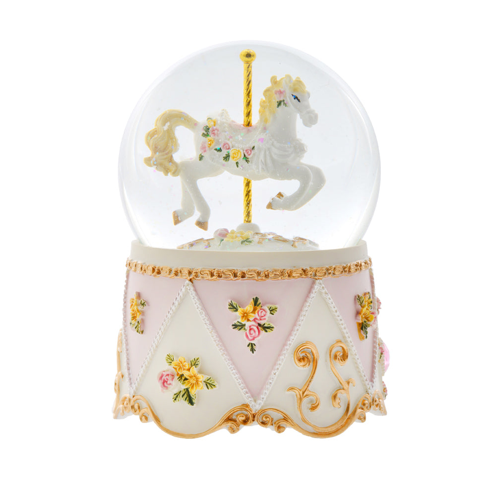 Step into a world of enchantment and timeless charm with our Ornamental Classic Musical Carousel Waterball. This exquisite piece is not just a decoration, but a cherished keepsake that captures the magic and whimsy of a bygone era. Perfect for parents seeking a unique and memorable gift, this waterball will mesmerize both young and old alike. At the heart of this beautifully crafted waterball is a delicate horse poised gracefully on a gleaming gold pole. This elegant horse is meticulously detailed, from its flowing mane to its ornate saddle, evoking the nostalgia of classic carousels that have brought joy to generations. The base of the waterball is equally captivating, adorned with intricate designs and finished in a luxurious, antique gold hue. This sophisticated base not only provides stability but also enhances the overall aesthetic, making it a standout piece in any room. One of the most enchanting features of this waterball is its musical element. When wound up, it plays the delightful Zauberflöte (Magic Flute) melody, a timeless tune that fills the room with a sense of wonder and serenity. The soft, melodious notes create a soothing atmosphere, perfect for bedtime routines or quiet moments of reflection with your child.