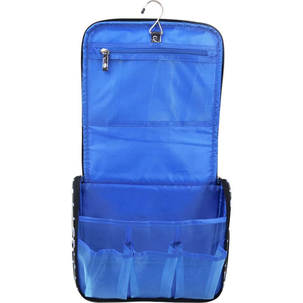 The essential travelling companion. Contains a large open space, mesh inserts to keep items in place, zipper pocket and hanging hook.