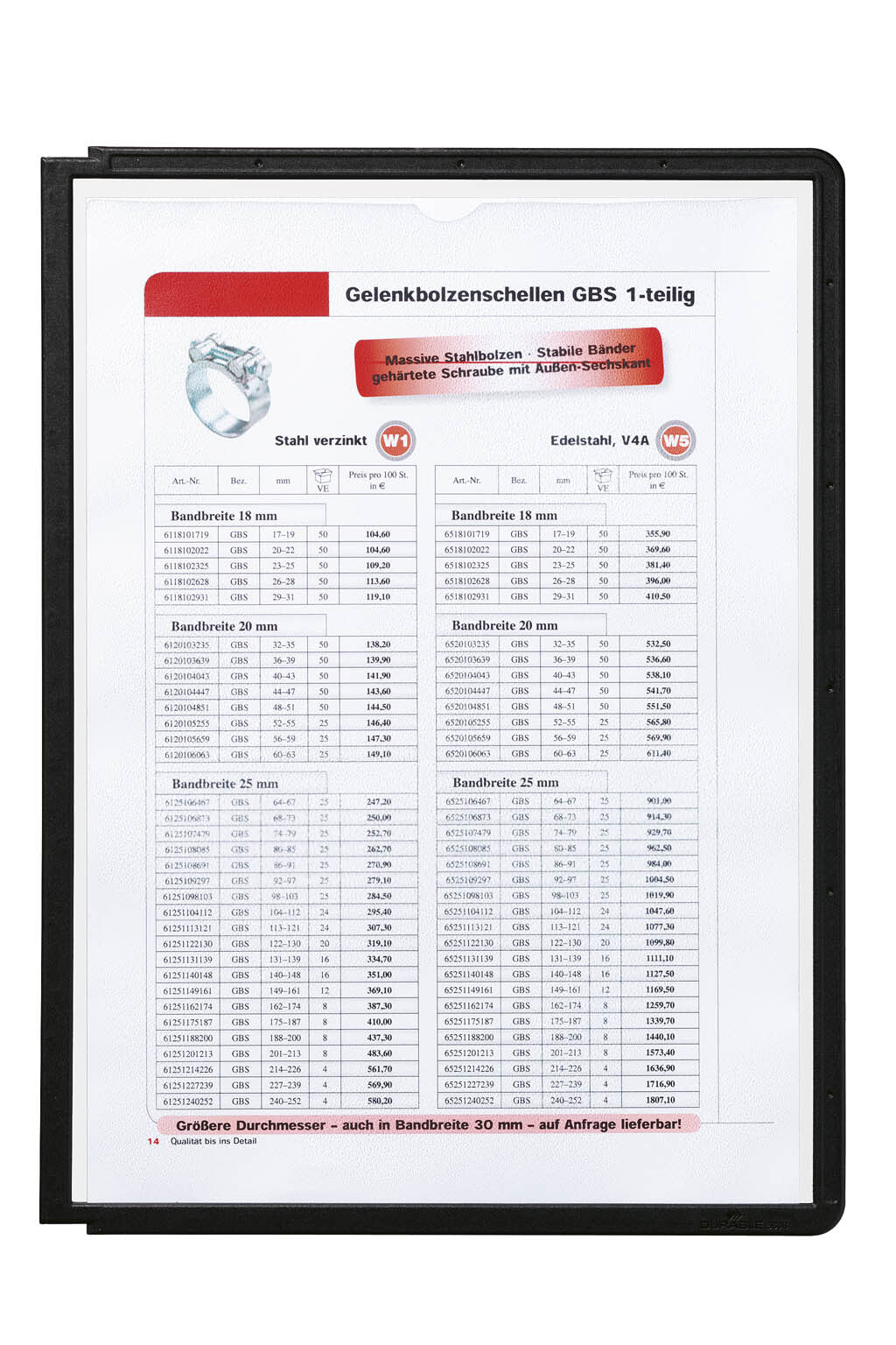 Made of polypropylene. With coloured frame around the edge. Low-reflection film, also suitable for scanners. For A4 information materials. Can be retrofitted with index tabs product # 5603 or 5609