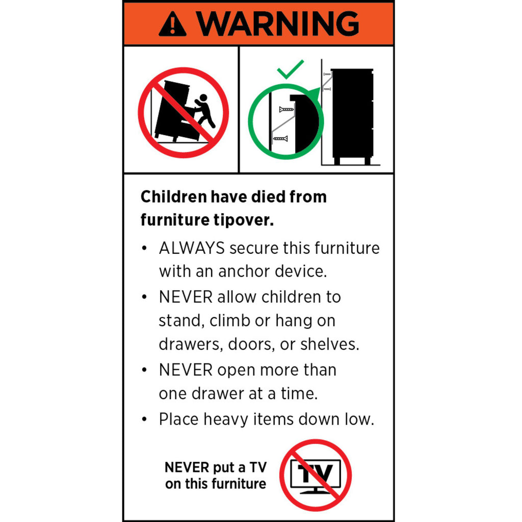NEVER allow children to stand, climb or hang on drawers, doors, or shelves.