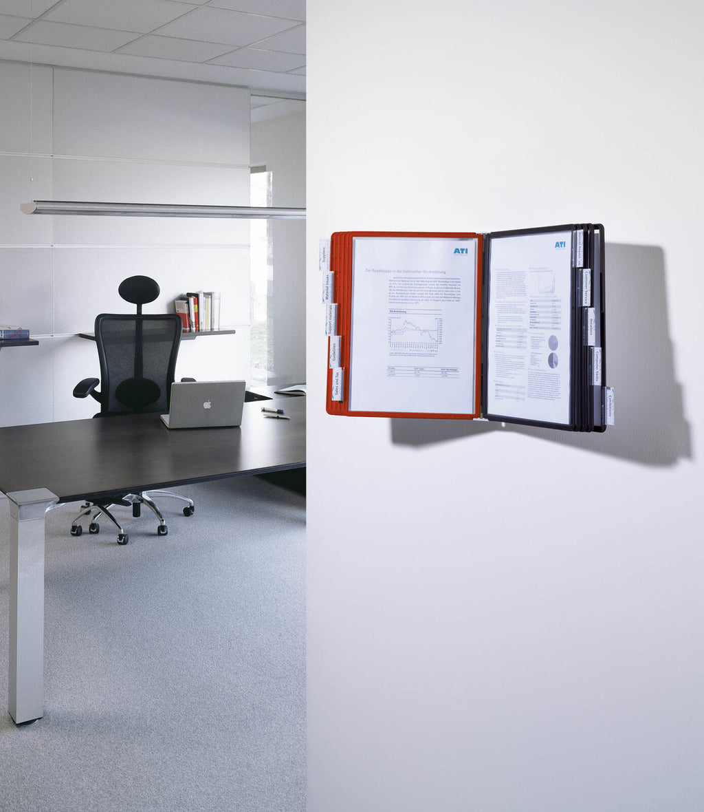 Complete set for use on wall. Consisting of a wall bracket and 10 SHERPA display panels in A4 format incl. index tabs. Ideal for reception areas, showrooms and exhibition ros.