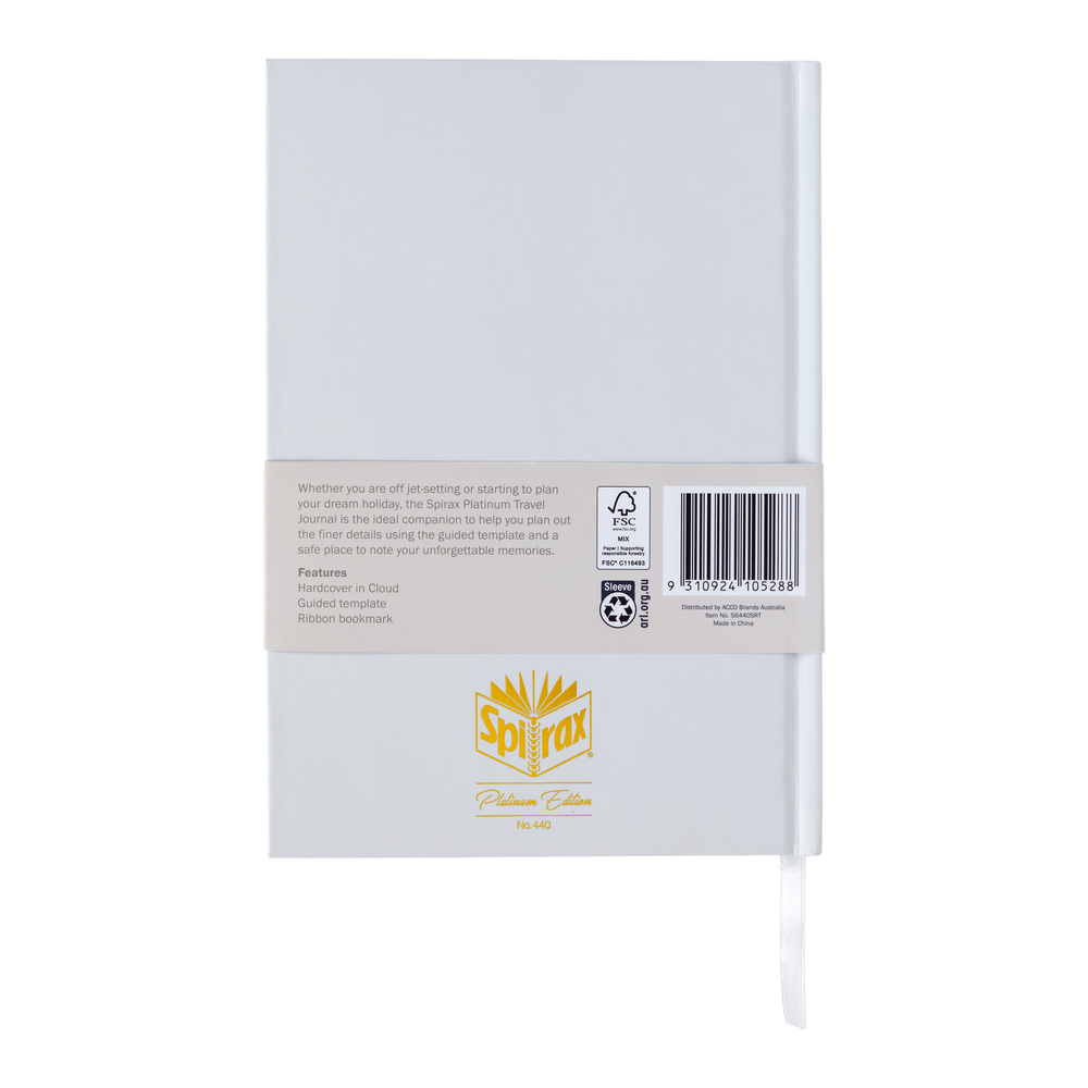 Whether you are off jet-setting or starting to plan your dream holiday, the Spirax Platinum Travel Journal is the ideal companion to help you plan out the finer details using the guided template and a safe place to note your unforgettable memories. Premium 100gsm paper. A5 size. Features a guided template to help support your travel goals. A ribbon bookmark to pick up where you left offIt has a hardcover to protect your pages.