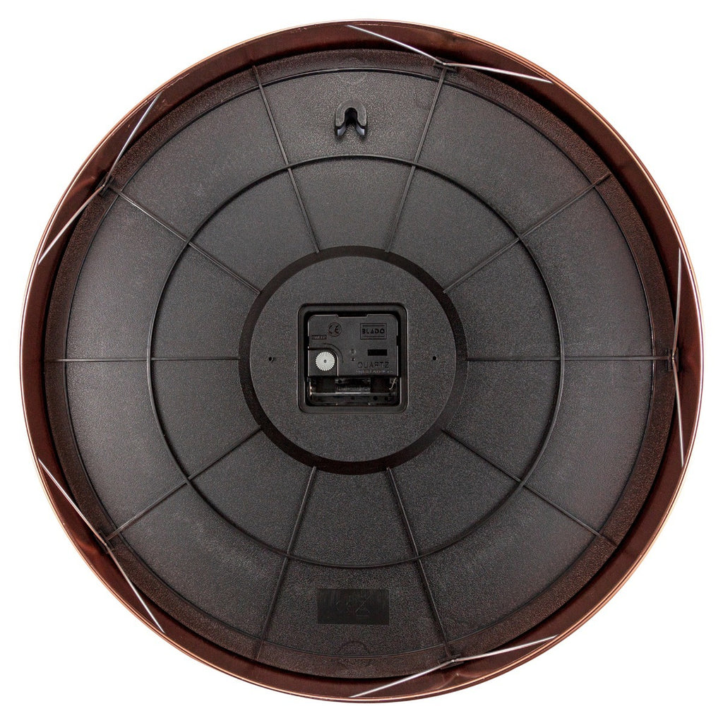 This clock features a copper-coloured brushed aluminium case that frames a striking wine-coloured dial. The glass cover protects the dial from damage and dust. The dial features white linear markings and a number at 12 o'clock. The simple thin hands give this clock a lovely chic and stylish design that suits many interior styles.