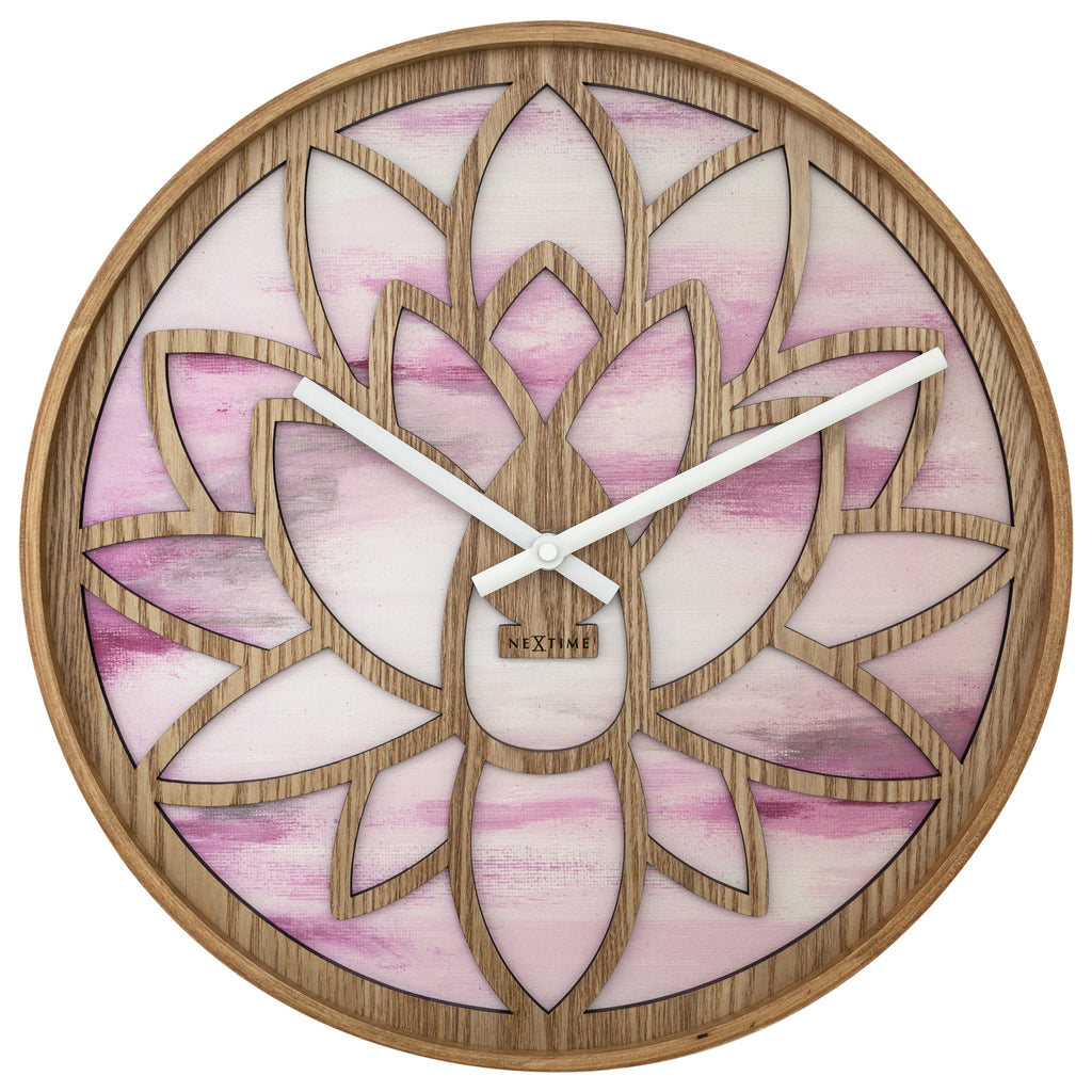 The Lotus wall clock dial features natural wood intricately cut in a harmonious lotus pattern that is laid over a calming pink watercolour background. This combination creates a peaceful mood in the atmosphere.