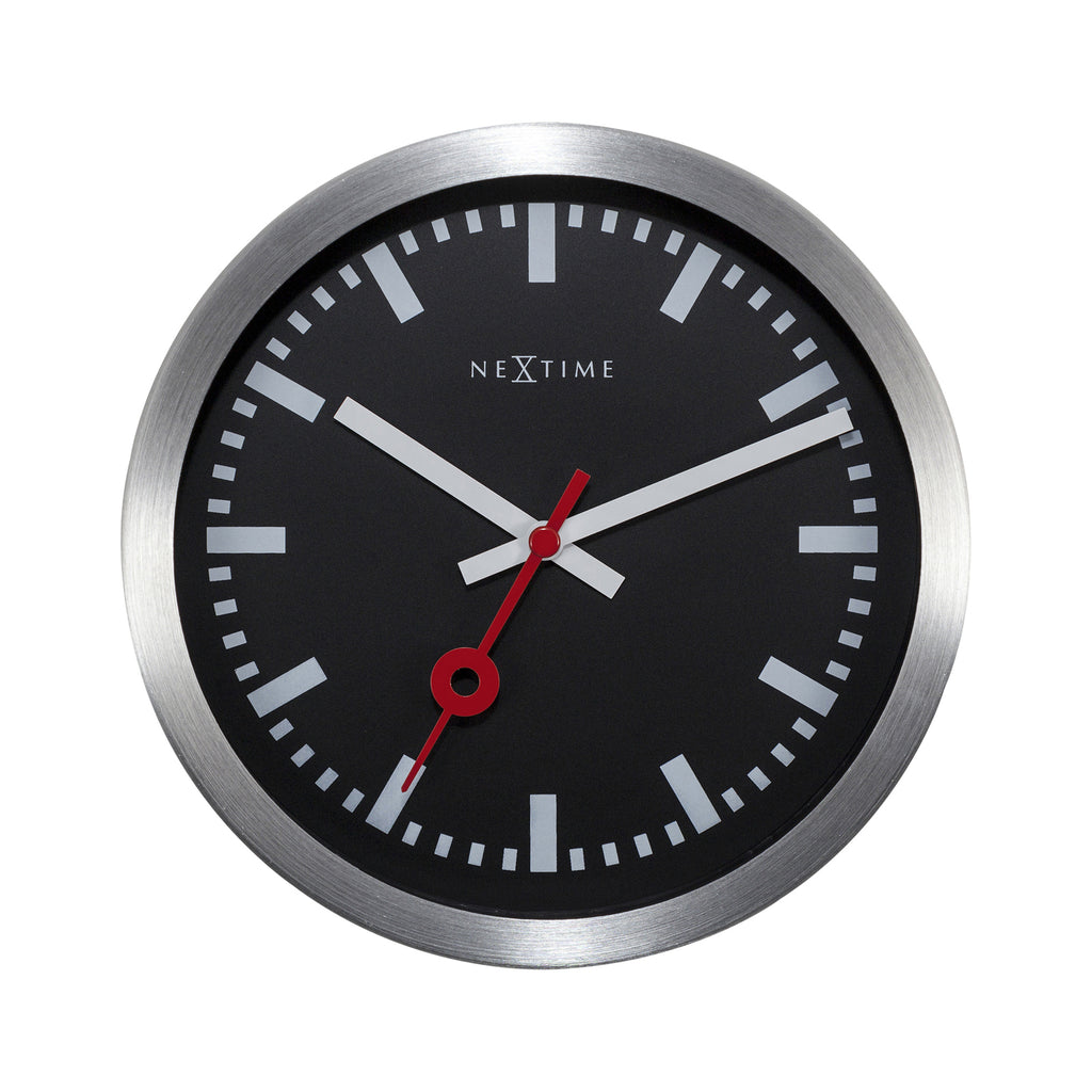 This small version of a traditional station clock fits perfectly in a home or office as it runs silently. An aluminium case frames the dial that features contrast linear markings that are easy to read and the glass lens protects it.