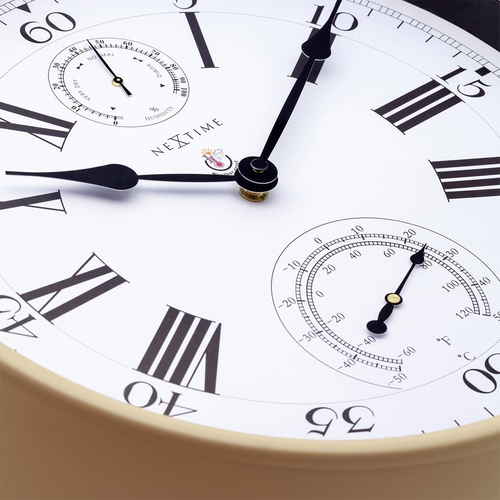 The NeXtime Hyacinth metal outdoor wall clock also features a thermometer and hygrometer on its dial. The thermometer shows both Celsius and Fahrenheit temperature readings and the hygrometer measures humidity as a %. Celsius temperature range of -50°C to 50°C.