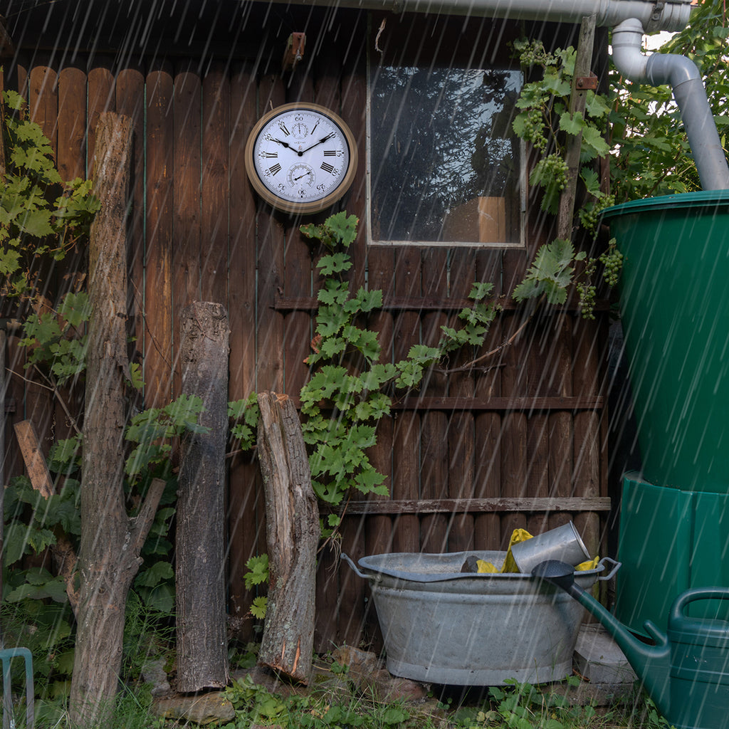 This multi-functional wall clock has internal rubber rings making it water resistant. It is suitable to mount in a protected, undercover area outside in a patio, garden, garage, poolside, farmhouse or backyard! It is not suitable to hang in direct sunlight and rain.