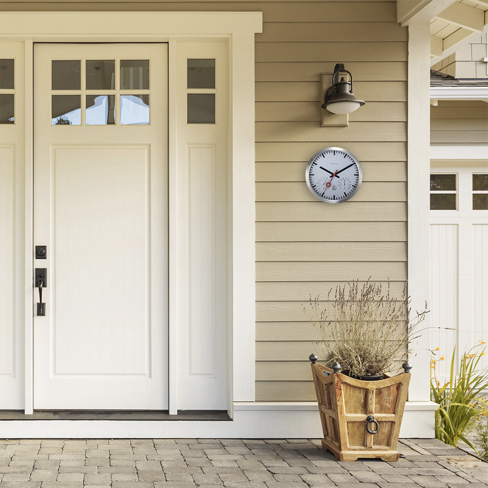 The NeXtime Clematis outdoor wall clock also features a thermometer and hygrometer on its dial. The thermometer shows both Celsius and Fahrenheit temperature readings and the hygrometer measures humidity as a %. Celsius temperature range of -40°C to 60°C.
