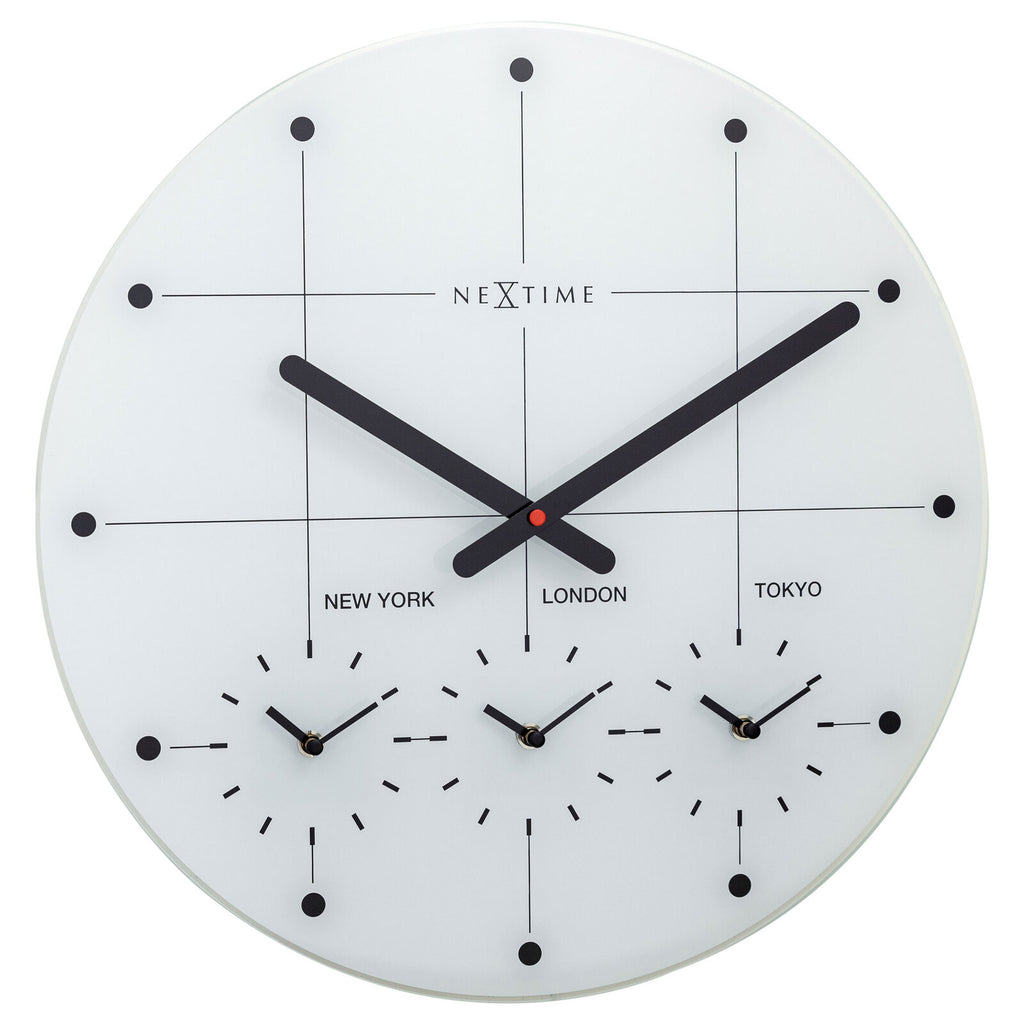 NeXtime’s Big City 43cm wall clock designed by Hans Muller and Hans van Dongen. The contrasting aluminium hands stand out against the glass dial. The clock displays 3 additional times zones, New York, London, and Tokyo. Great for offices (or home offices). This clock has an open face.