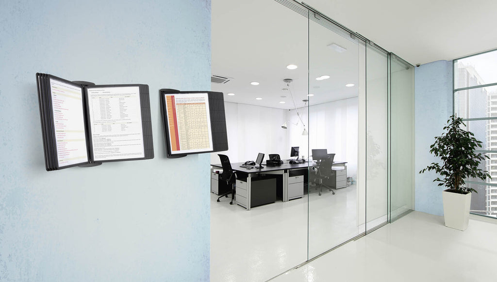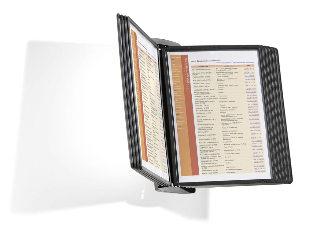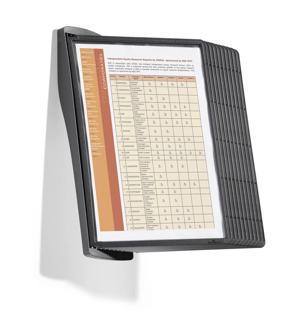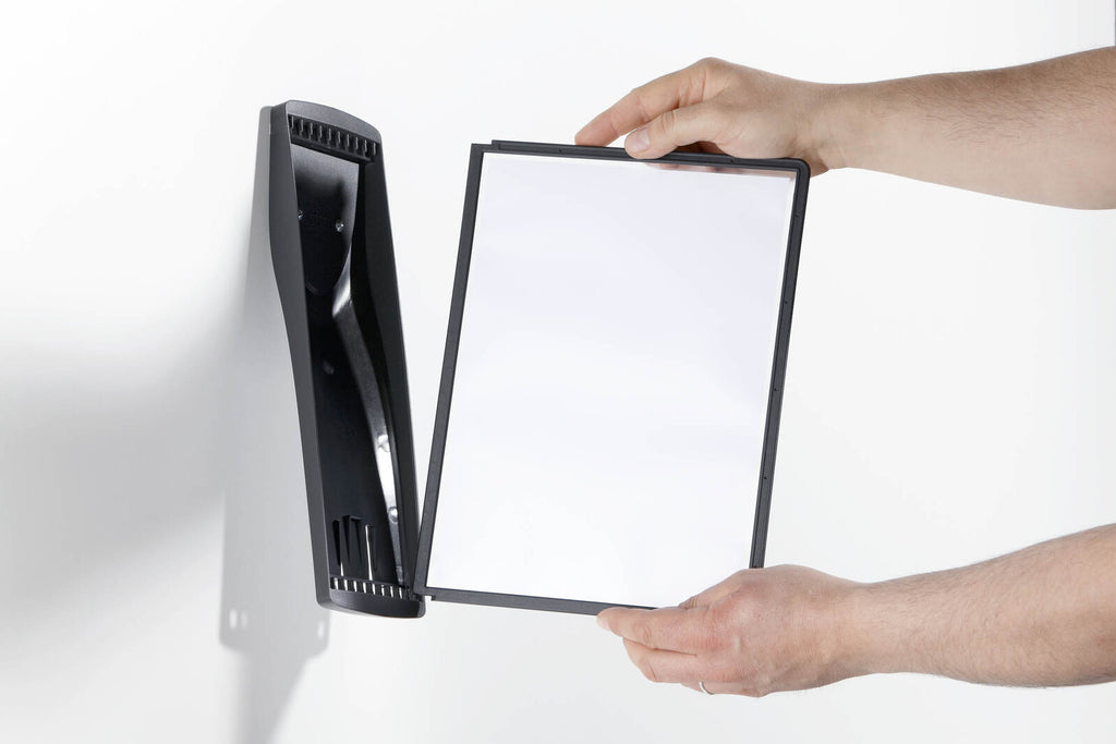 Complete sets for use on walls. With 10 polypropylene display panels in A4 format. 10 index tabs for easy organisation. Panels and brackets in black.