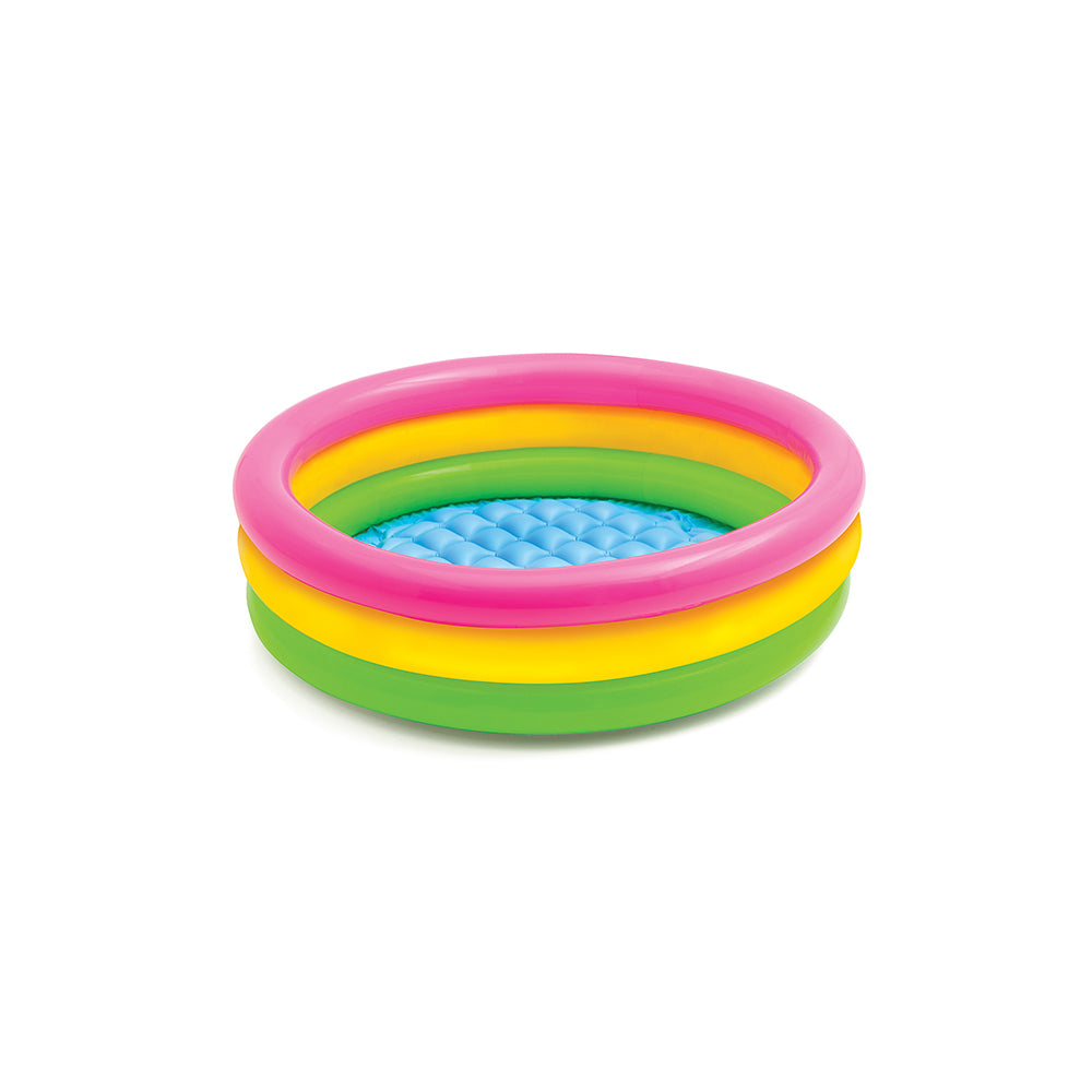 Make a splash this summer with the colorful Sunset Glow Baby Pool. This cute baby pool has three colorful air rings and a soft inflatable floor for comfort.