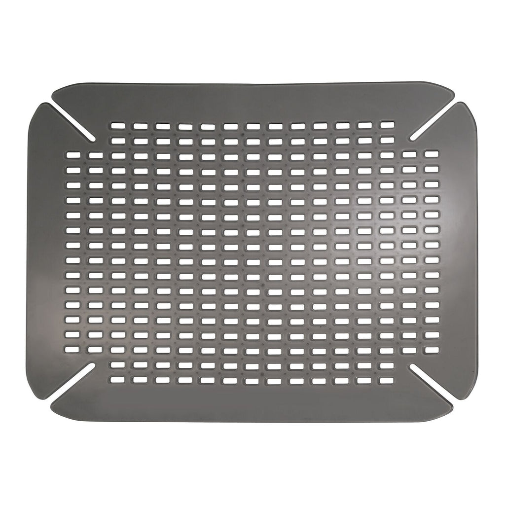 Protect your kitchen sink in style with the iDesign Contour Sink Mat. This kitchen sink liner protects the sink as well as dishware, flatware, glasses, pots, pans, and more from scratches and damage during washing and drying. The open design allows water to drain through the mat, and the flexible PVC material grips the sink so it stays in place while in use. The versatile design is compatible with any type of sink including stainless steel, metal, and ceramic, and it can also be used in bathroom, laundry room, and utility sinks. The sleek graphite gray color with modern grid pattern adds a decorative touch to the sink, and it matches other items in the Contour collection (sold separately) to add coordination to your kitchen decor. Made with durable BPA-free PVC plastic, this sink mat stands up to every day use and is dishwasher safe for easy cleaning and care. Measuring 10.75" x 12.5", this flexible sink protector has corners that curve up in smaller sinks and lay flat in larger sinks, making it ideal for a variety of sink sizes.