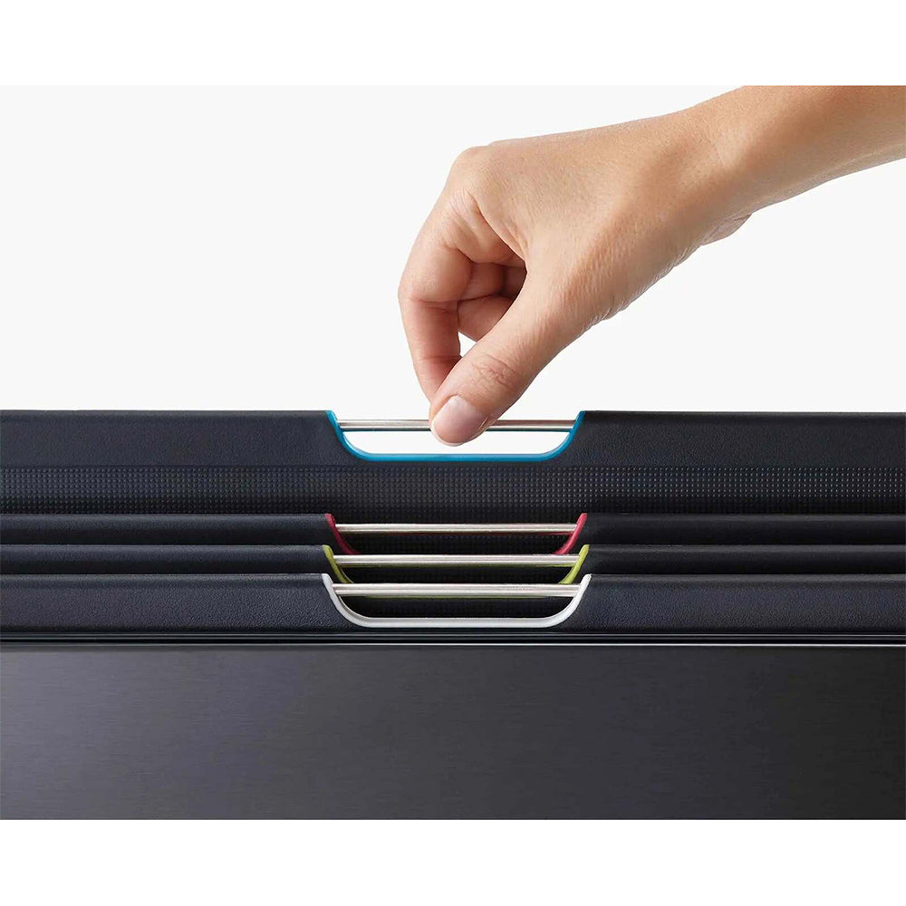 This stunning design features a slimline, stainless-steel case that keeps four large chopping boards beautifully organised and makes a real statement on the worktop. Each colour-coded board has a knife-friendly, textured cutting surface on both sides and non-slip feet. They can be easily removed from the case due to the smart angled design and stainless-steel selecting bars. The case holds each board neatly apart, allowing air to circulate, and features a fingerprint-proof coating to make cleaning easy and non-slip feet on the base. Available in a range of premium colours. Dimensions: H26.3 x W35.6 x D7.2 cm (H10? x W14 x D2? inches) Board size: 24 x 34 cm (9½ x 13? inches)