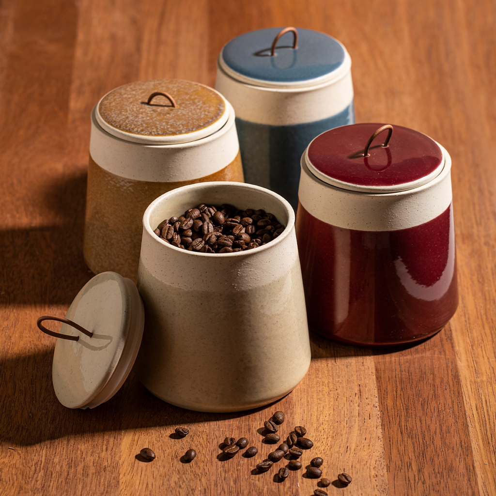 With their unique design, our Aster canisters fit right in any home. Each canister is finished with a reactive dipped glaze and a features exposed speckled clay around the bottom, with a leather hand pull on the lid. These versatile pieces can be used around the kitchen, home office or bathroom.