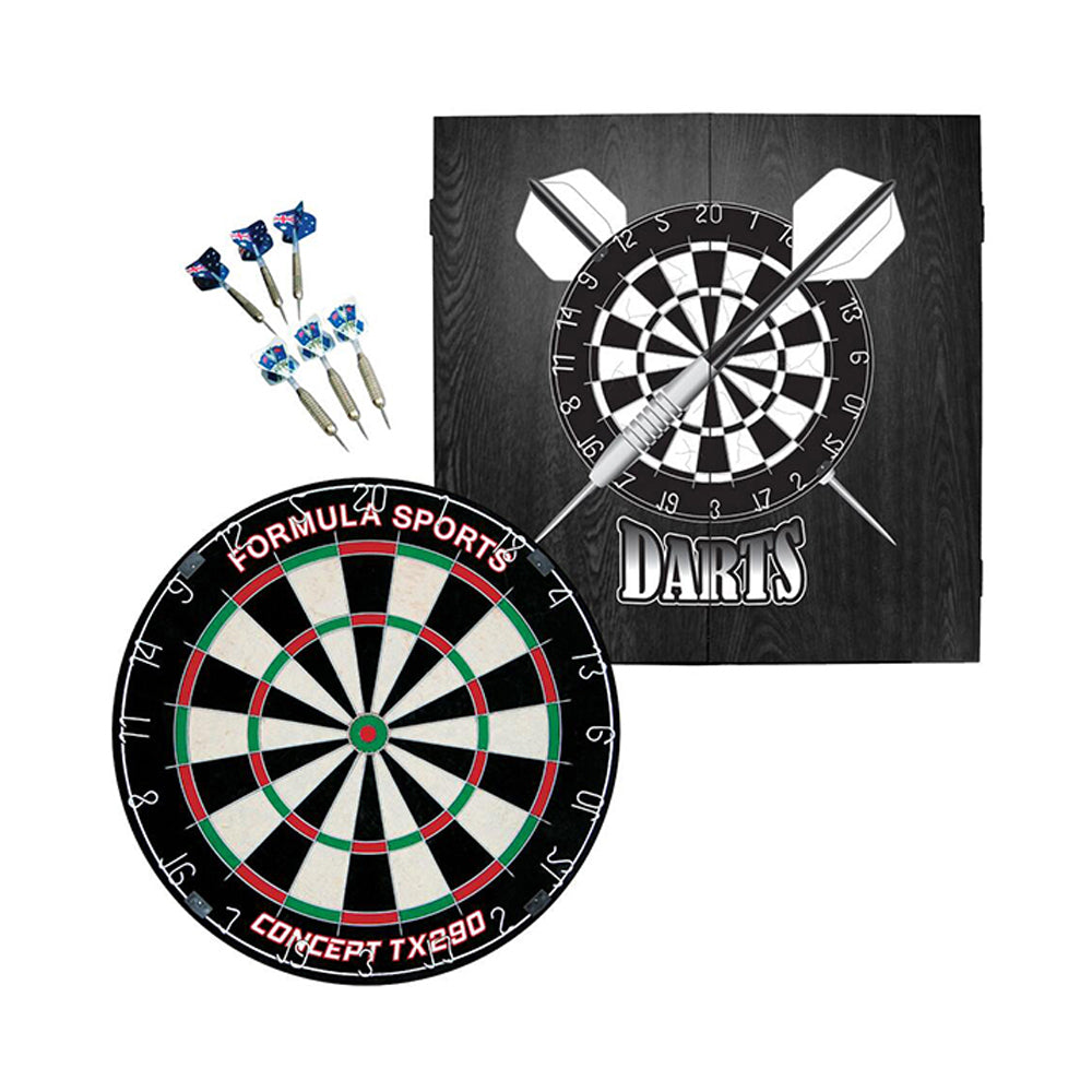 With a black wall mountable cabinet featuring a beautiful black & white 'dart-centric' design, the popular Concept TX290 Dartboard and 2 sets of darts!