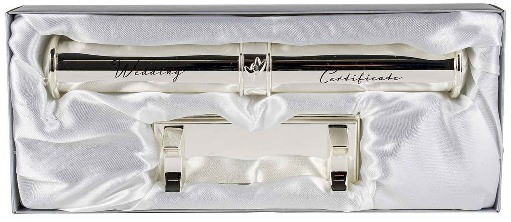 When words don't seem enough to tell someone how proud you are, say it in style with this personalised certificate holder and stand which can be engraved with a heartfelt message of your choice. With a screwable cap on either end, this holder can stores a wedding certificate which can then be displayed in pride of place in the family home. This silver plated certificate holder sits on a sturdy base and is a long-lasting reminder of a memorable event.