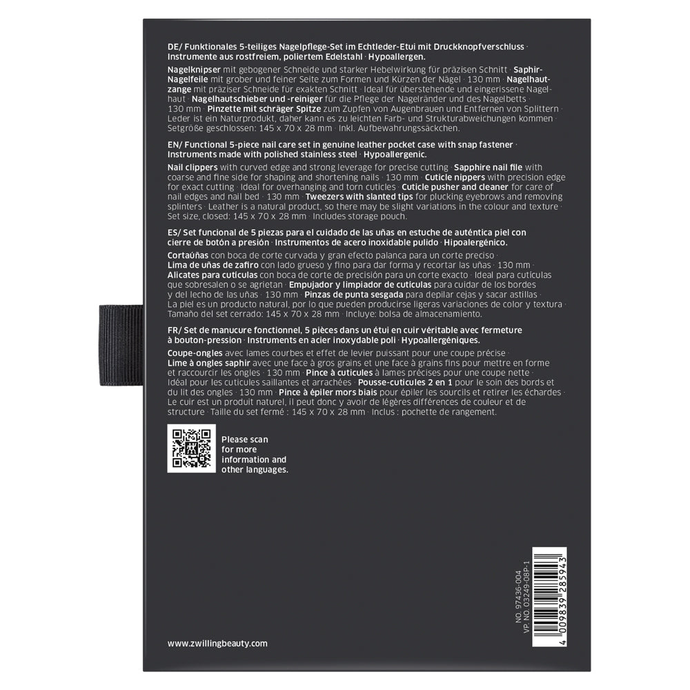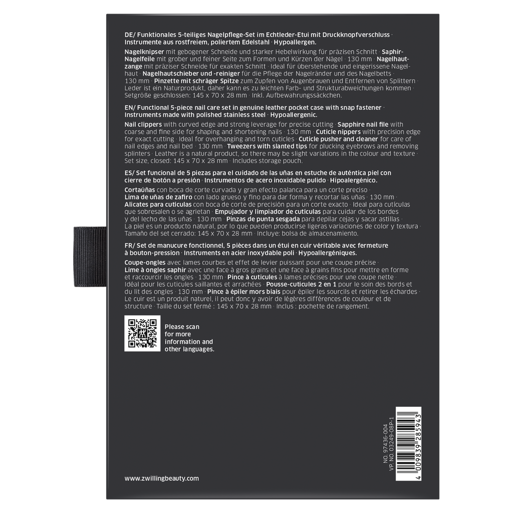 This ZWILLING 5 piece pocket case ensures that you always have beautifully manicured and well looked after nails at home and on your travels. The set is contained within a black leather pocket case, giving it a luxurious sophisticated appearance and making it hard-wearing for many years to come. Its compact size means that it fits easily into any bag so that you can conveniently and practically take it away on your travels. You'll always have the right instrument to hand if a nail should tear or another minor nail emergency should arise.
