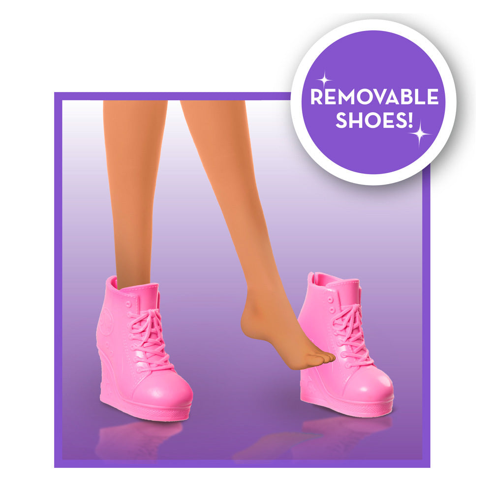 Barbie is gorgeous in her outfit, which has a glittering pink bodice, a tiered skirt of shimmering metallic and tie-dye tulle, and detachable pink shoes.