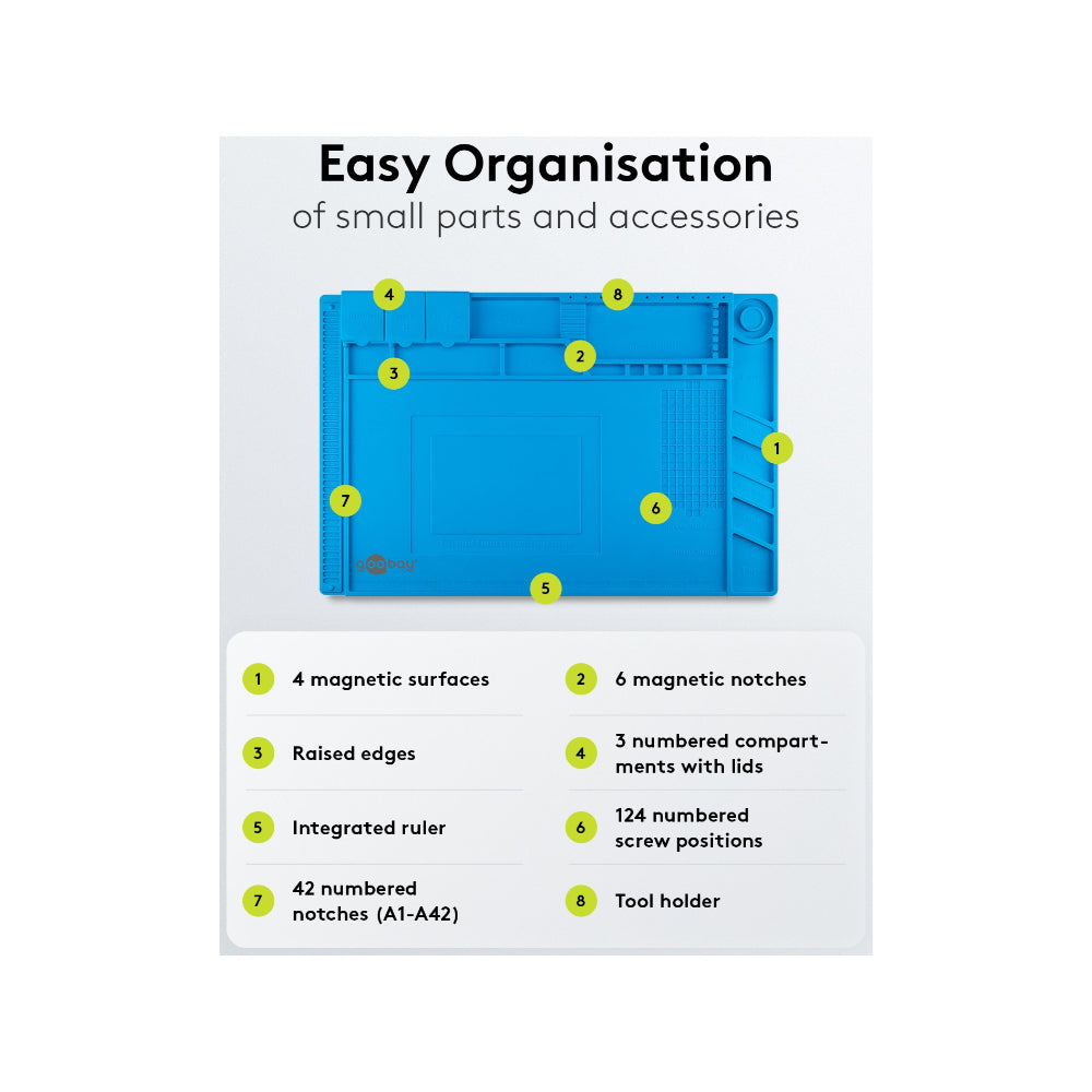 The Goobay Silicone Soldering Mat is a flexible, non-slip repair station measuring 450x300mm, designed for safe soldering, repairing, and crafting. Made from high-quality, heat-resistant silicone, it withstands temperatures up to 450°C, making it ideal for electronics like smartphones, laptops, and cameras. Featuring four magnetic surfaces, six notches, and three numbered compartments with lids, it keeps small parts organized. An integrated ruler aids precision work, ensuring a reliable workspace for all your repair needs.
