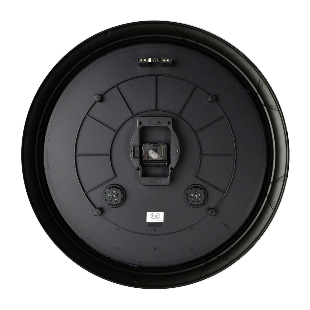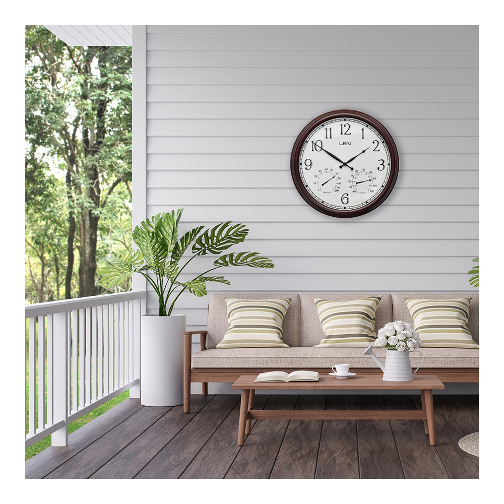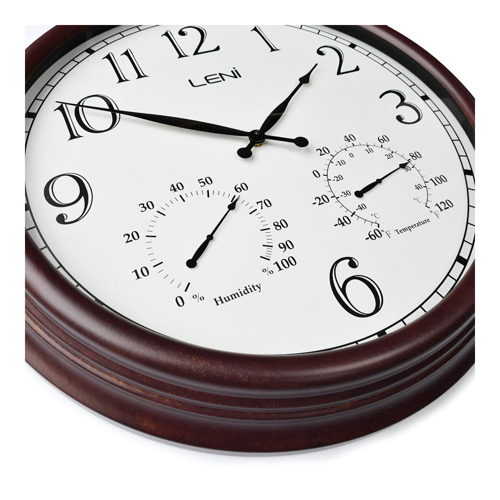 The multifunctional clock shows the time and features a thermometer and hygrometer on its dial.