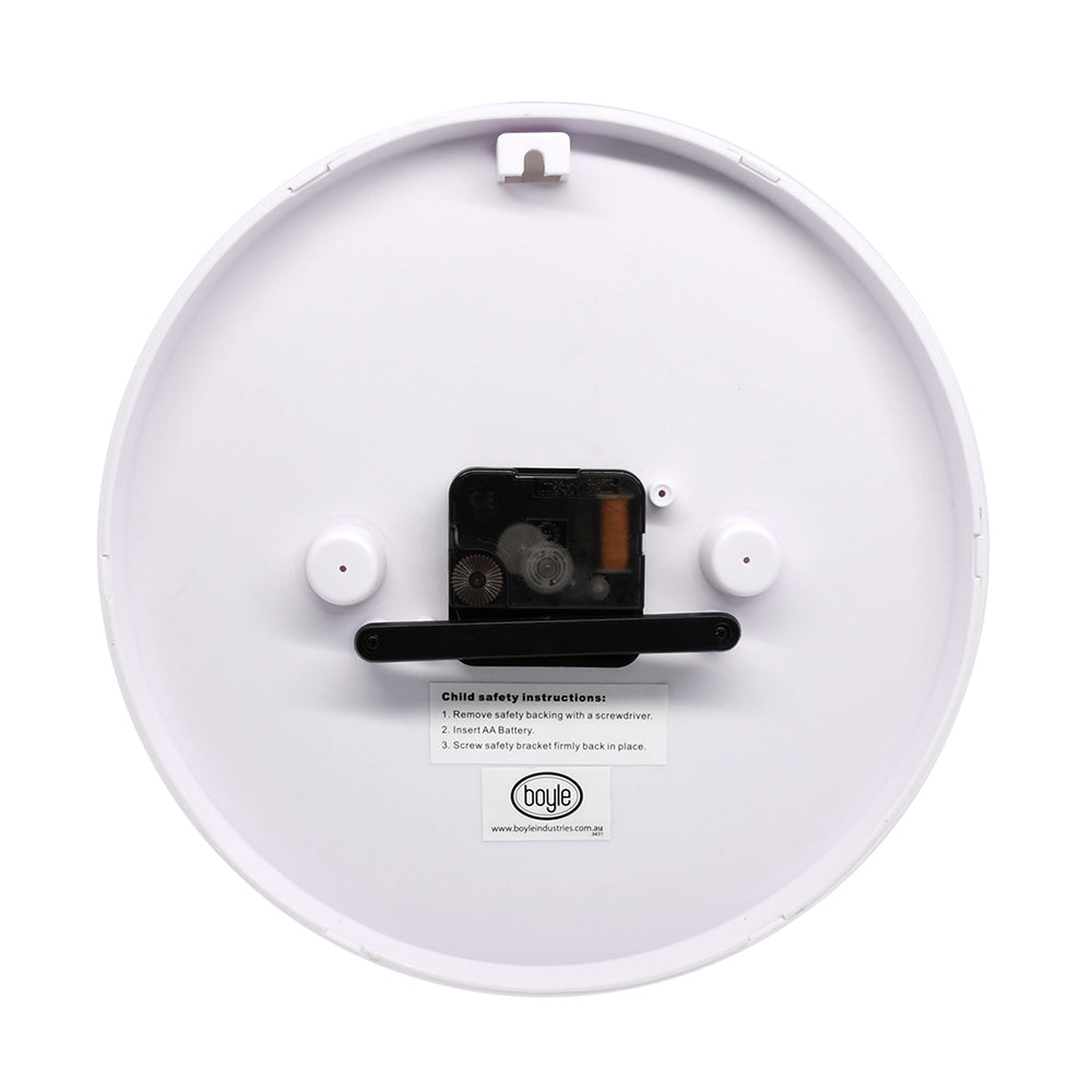 The clock has a glossy bright white plastic case that frames brightly coloured numbers printed on the dial.