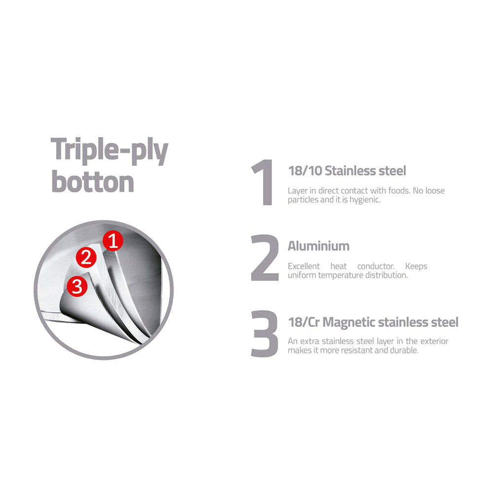Tramontina's 30 cm 2.9 L shallow stainless steel frying pan with long handle and tri-ply base from the Professional line is the right choice for those who wish to do much more in the kitchen. Its tri-ply base (stainless steel + aluminium + stainless steel) has been designed to distribute heat uniformly for faster and even cooking.
