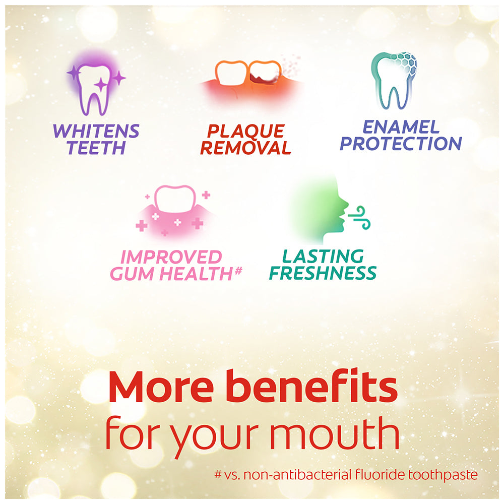 Colgate Total Original Antibacterial Fluoride Toothpaste reduces bacteria on teeth, tongue, cheeks and gums.