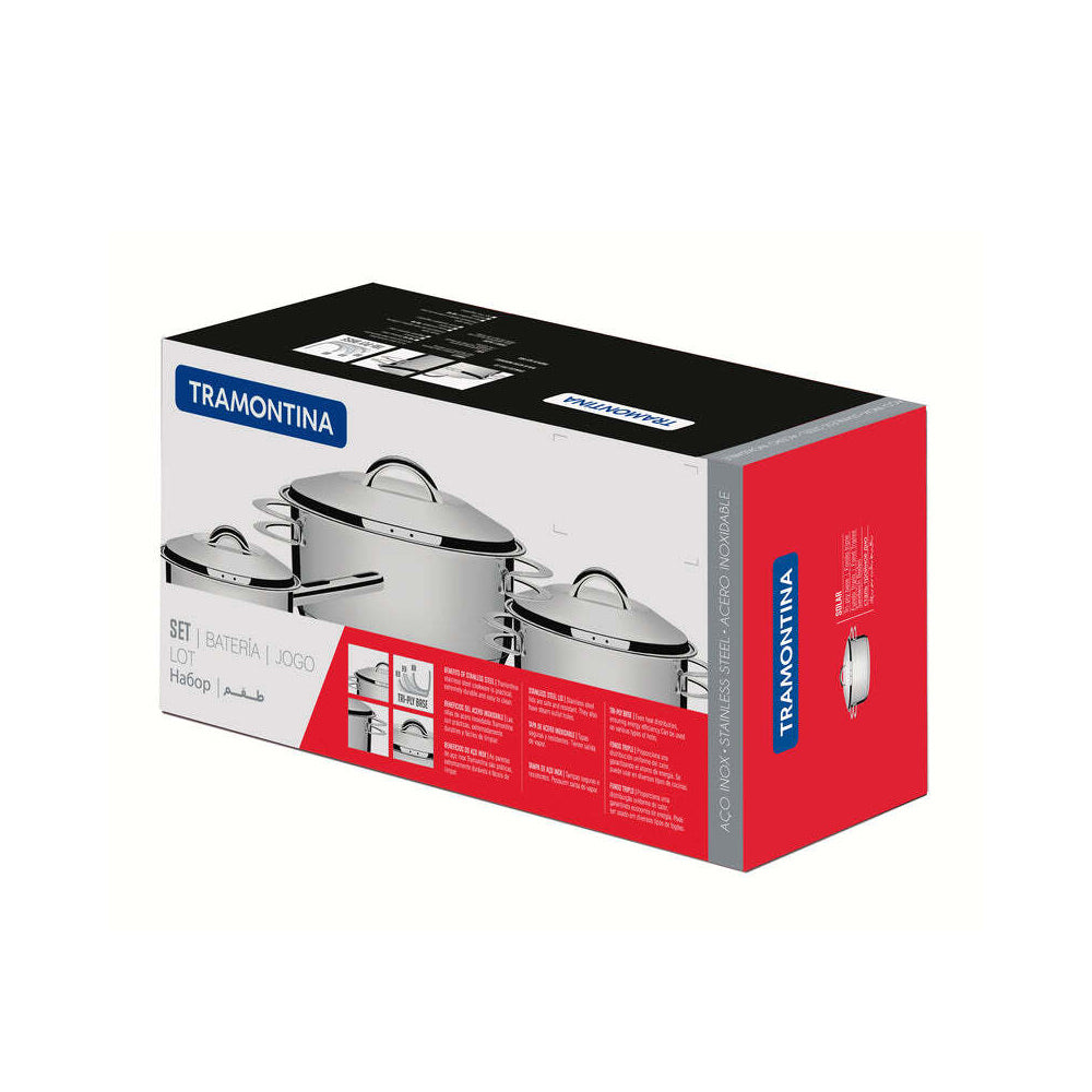 Before using the product remove any labels and wash it with hot water and detergent.Use on a low heat so that the food does not stick to the bottom of the pan, the triple body of the pan, made of stainless steel + aluminium + stainless steel, distributes heat uniformly, so that a high heat is unnecessary. Additionally, it is more economical on fuel.When the pan is used on a gas stove, the flame must not rise above the base of the pan. If using an electric plate, it must have an equal or smaller diameter than the one of the pan.Always dissolve salt in boiling water or in the food, mixing the ingredients when cooking begins.Do not heat food by placing a pan of the same diameter on top of another. This procedure is dangerous as it creates a vacuum and makes it difficult to remove afterwards.If the lid of the Tramontina stainless steel pan sticks due to the vaccum effect during cooling, it suffices to push it upwards or to reheat the pan again so as to neutralize the vacuum effect.The stainless steel handles acquire heat during cooking. We advise the use of gloves when handling them.Some food containing starch such as pasta and rice, may stain the internal part of the pan while cooking. In order to remove stains easily, rub them with a cloth which has been dampened with lemon juice or vinegar, or use the stainless steel polishing paste by Tramontina.Avoid leaving food in the pan for a long time; salt may also stain the pan.In order for the Tramontina stainless steel pan to always be attractive and shiny, we recommend it is only washed with detergent and a soft sponge. Tramontina developed a special paste to polish and remove stains on stainless steel products, which is available at points of sale.Whenever possible, rinse the pan with hot water after washing and dry immediately so as to maintain its original sheen. Chloride and other substances in water may stains the pan.It can go in the oven at a maximum temperature of 260°C. Changes in color might happen.Do not leave an empty pan over a source of heat.Leave pans only on surfaces that are heat resistant.