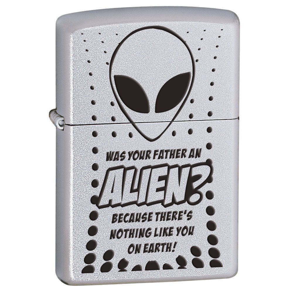 This Was your Father an Alien? Zippo Lighter features a Satin Chrome Finish, and is a genuine Zippo product and comes packaged in an environmentally friendly Zippo Gift Box directly from the Zippo Manufacturing Company. Every Zippo product we sell is brand new, sealed in Zippo’s original packaging. Buy this genuine Zippo product today for yourself, or as a gift for family or a special friend!