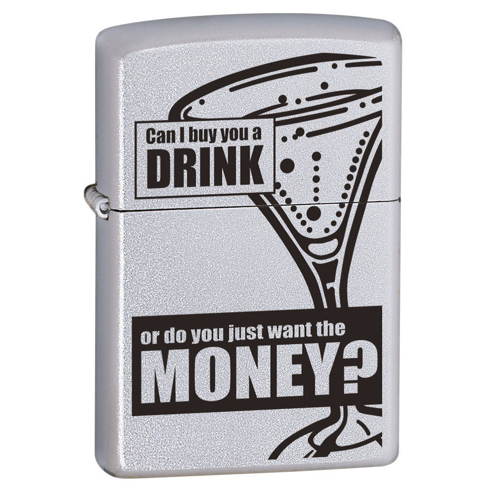 This Can I Buy You A Drink Zippo Lighter features a Satin Chrome Finish, and is a genuine Zippo product and comes packaged in an environmentally friendly Zippo Gift Box directly from the Zippo Manufacturing Company. Every Zippo product we sell is brand new, sealed in Zippo’s original packaging. Buy this genuine Zippo product today for yourself, or as a gift for family or a special friend!