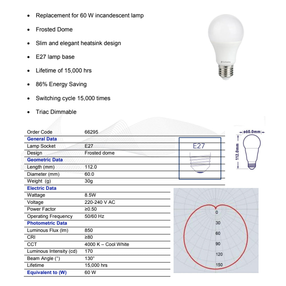 Verbatim E27 Screw Cool White Classic A Dimming Light Bulb 8.5W/850lm/4000K