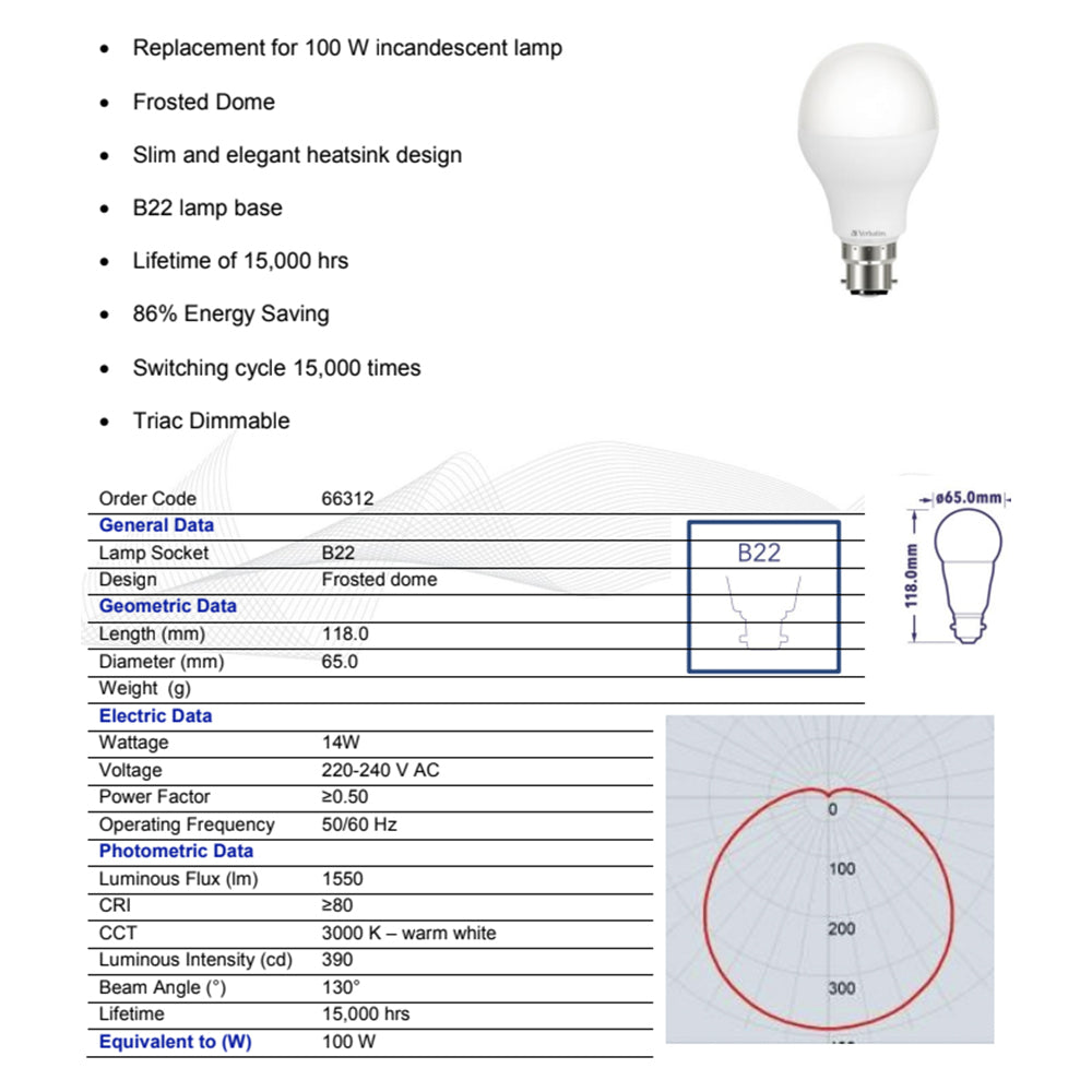 Verbatim B22 Bayonet WW Classic A Dimmable Light Globe 14W/1550lm/3000K