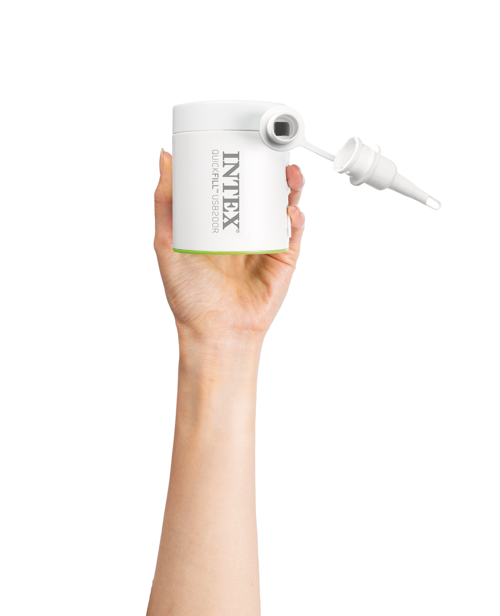 Take the INTEX® QuickFill® USB Rechargeable Air Pump along on your next outdoor adventure. It can inflate or deflate pool floats, camping mats, air mattresses, and more but fits right in your hand. The included adapter with 2 nozzles makes this pump a versatile match for different valves. Charge it via USB-A port or home outlet (USB-A cube not included)—it even doubles as a power bank to charge other USB devices. RECHARGEABLE USB-C PUMP makes outdoor use easy: To recharge the pump, simply plug its USB-C connector into the USB-A port of a charged, separate device. Then, use the pump to inflate and deflate pool floats, camping mats, air mattresses, and more RUN TIME: 45 minutes 2 INTERCONNECTING NOZZLES are included, enabling versatile use of the pump across a variety of different inflatable products with a range of valve sizes PORTABLE INFLATION – The pump's 200 L/minute maximum airflow and convenient size make it an efficient, compact solution for outdoor inflation needs POWER BANK USE – Contains a rechargeable NI-MH battery (2000 mAh) and doubles as a power bank for some USB-powered devices such as smartphones, smartwatches, and tablets