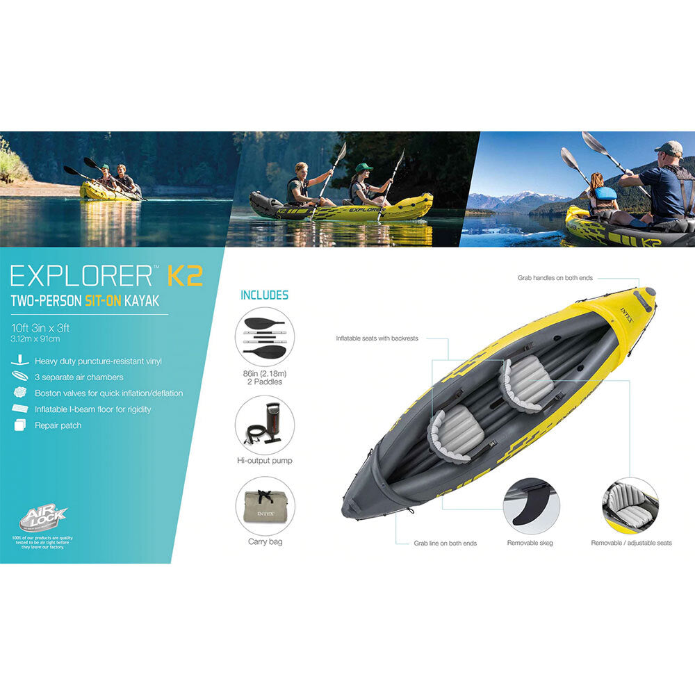 The Intex Explorer K2 Kayak is sporty and fun with a streamlined design for easy paddling. The bright yellow color and sporty graphics makes the kayak highly visible in the water. Great for experiencing lakes and mild rivers with a friend, this Sports Series kayak is perfect for two adults. Lightweight and compact, this kayak is a snap to assemble, and allows you to take the fun of kayaking wherever you go. Made with rugged vinyl construction, this sturdy kayak has an inflatable I-beam floor for comfort and rigidity. A removable skeg provides directional stability, while two adjustable, inflatable seats with backrests are included for comfort. Quick inflating or deflating is a breeze with a Boston valve on each side. A grab line and grab handle at each end is provided for your convenience, as well as a U.S. Coast Guard I.D., and a repair patch kit. The Explorer K2 Kayak provides added accessories including: two 86in aluminum oars and an Intex high-output pump for easy inflation and deflation.