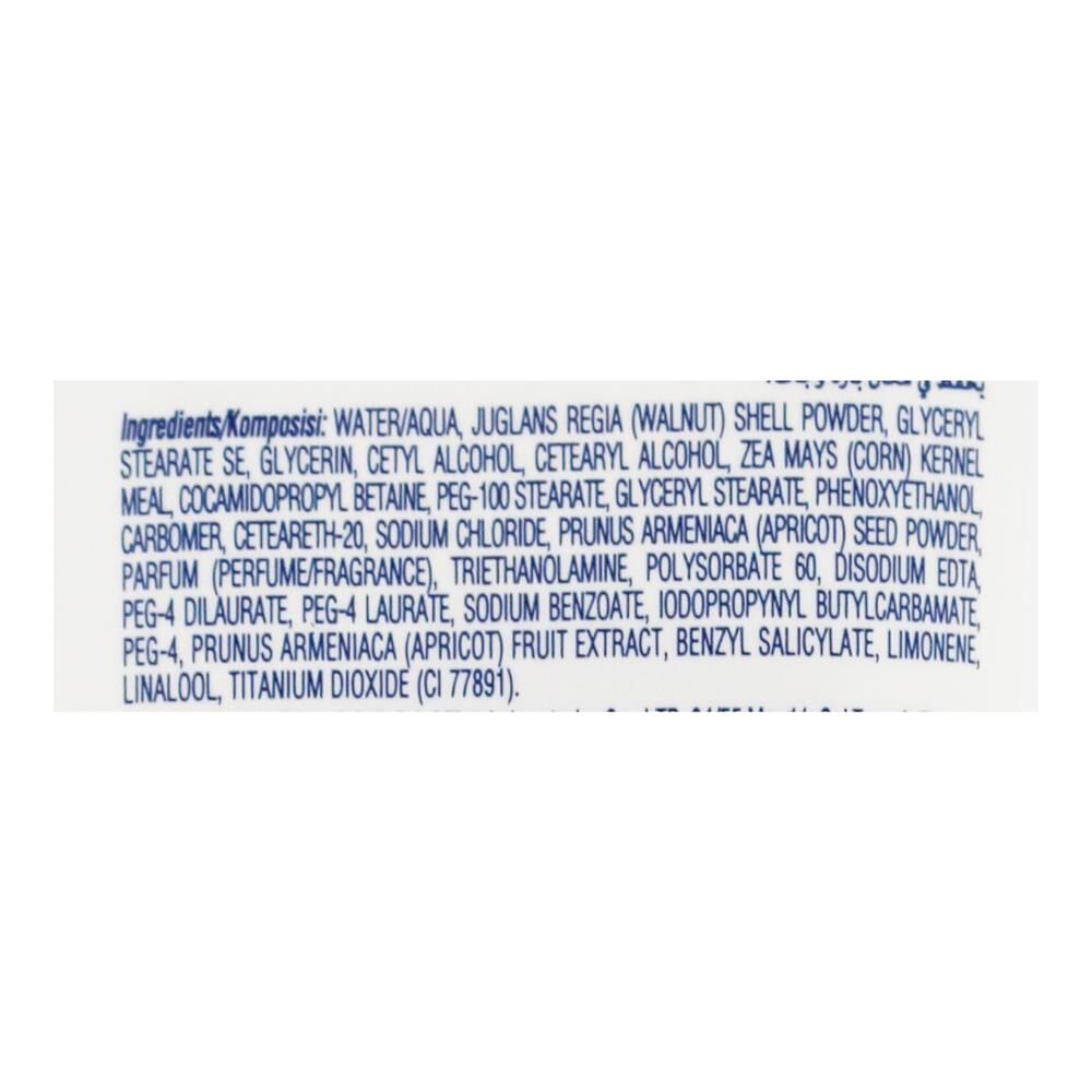 Water (Aqua), Juglans Regia (Walnut) Shell Powder, Glyceryl Stearate SE, Glycerin, Cetearyl Alcohol, Zea Mays (Corn) Kernel Meal, Cetyl Alcohol, Sodium Lauryl Sulfoacetate, Cocamidopropyl Betaine, Glyceryl stearate, PEG-100 Stearate, Cetyl Acetate, Benzyl alcohol, Ceteareth-20, Acetylated Lanolin Alcohol, Carbomer.