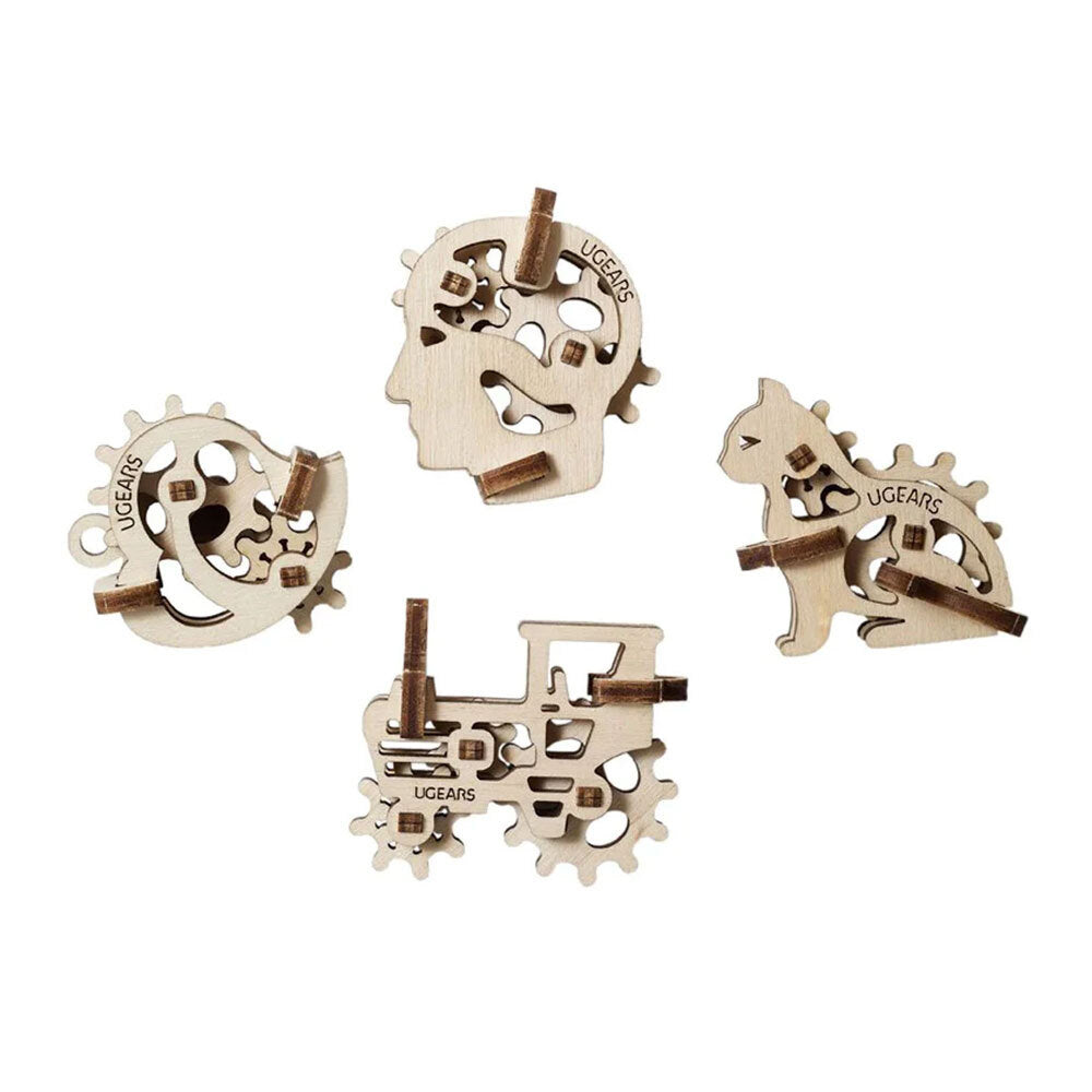 Ugears Australia U-Fidgets Tribics. The unique 4 sets of the individual miniature models (4 tribics in each set) for grown-ups and kids which are made entirely from wooden materials and assemble easily without glue or toothpicks. Use them to organize your thoughts and ideas, drive new insights, relieve stress, regain control over your emotions. Let them become your everyday life companions as key-charms or original trinkets.