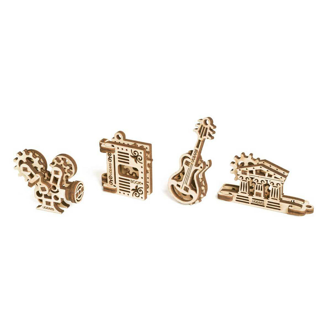 The unique 4 sets of the individual miniature Ugears models: Camera, Guitar, Book,