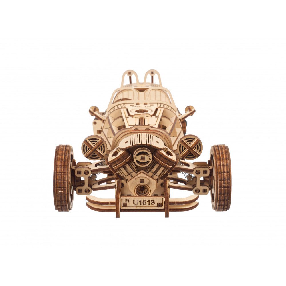 The Three-wheeler UGR-S is the latest and coolest addition to the Ugears collection of motorcycles and automobiles. This stylish two-seater is a three-wheeled road and attention hog, with spring drive, front and rear suspension, a functional steering wheel that turns the front wheels left and right, and loads of great detail like moving pistons, big headlamps, custom exhaust pipes running along the side, a suitcase to place in the side-mounted luggage holder, and laser engraving. And that's not all—lift the two sides of the engine hood to see the gas tank and spring motor!