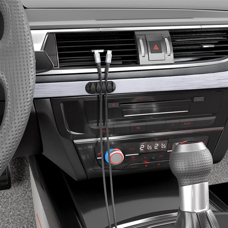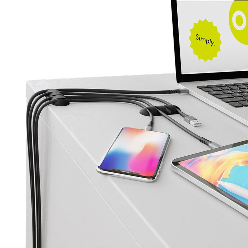 The flexible cable guide secures cables within reach and prevents e.g. charging cables or other USB connections from slipping behind and under the desk. Also perfect for routing cables under the desk.