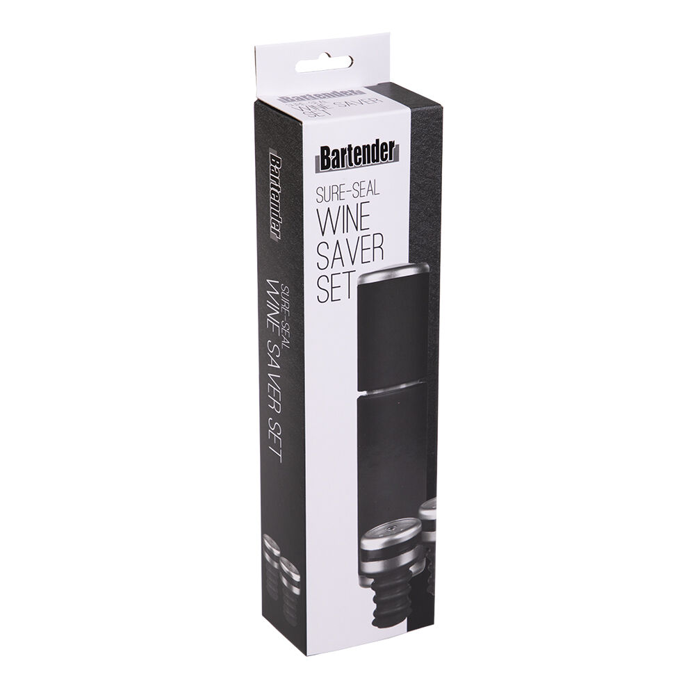 Take the guess work out of resealing open bottles of white or red wine. Using a built-in indicator on the stopper and a multipoint airtight seal, the Bartender Sure-Seal Wine Saver Set precisely removes the exact amount of oxygen required without damaging the preserved wine of its natural flavours and aroma, reducing oxidization and prolonging a wine's lifespan. To use, push stopper into bottle, line up vacuum pump with stopper and pump until the indicator disappears. Airtight seal allows bottles to be laid horizontally. If the indicator reappears, it's time to drink your wine, or repressurise.