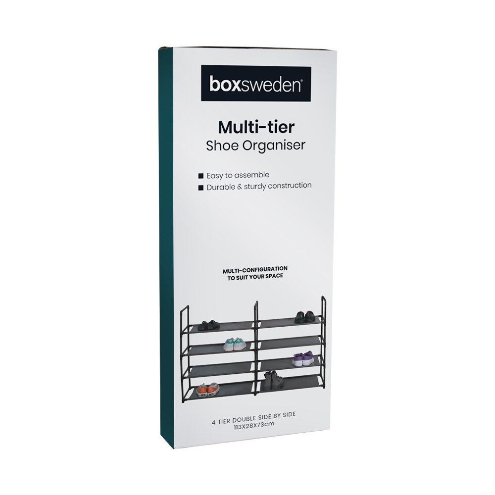 Enjoy a neat wardrobe by utilising our Boxsweden Double 4 Tier Shoe Rack. Our design is multi configuration to suit your space, easily assembled, and has a sturdy and durable construction.
