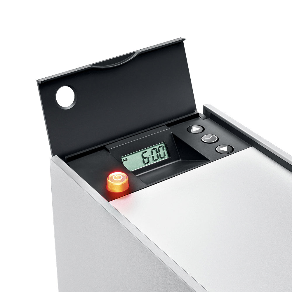With programmable switch-on and switch-off times, the modern cup warmer has eco-intelligence. It can be easily adapted to your needs and warms the cups at just the right time for your morning coffee. If no switch-off time is programmed, the intelligent machine switches itself off automatically after 12 hours.