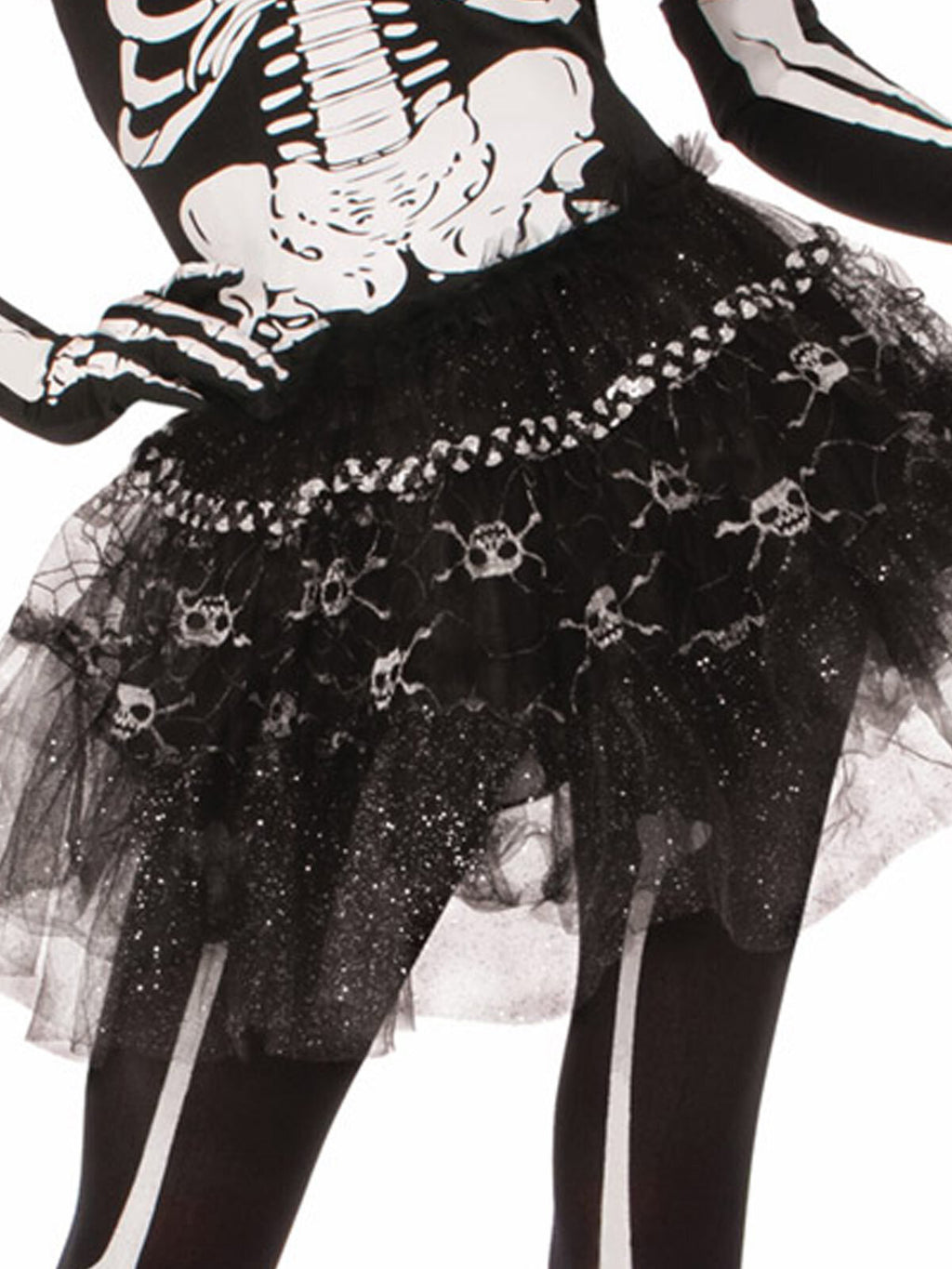 Skirt has tulle overlay plus printed skulls and waist band