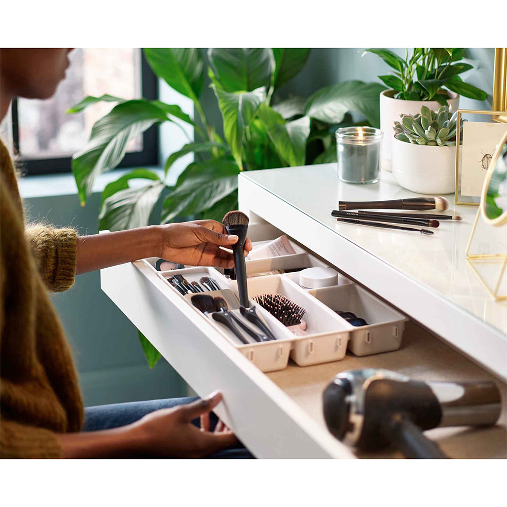 This modular design will turn makeup mayhem into cosmetics calm in no time. It comprises a set of individual trays of different sizes that can be clipped together on all sides, allowing you to arrange them in any order to fit your drawer space. To change the order, simply unclip each tray and rearrange as necessary. Perfect for organising and storing a wide range of beauty and grooming items including makeup, eyeliners, lip pencils, brushes, nail polishes, hair accessories and more. The set includes a tiered makeup brush holder and self-adhesive, non-slip feet which can be applied once the final arrangement of trays has been decided.