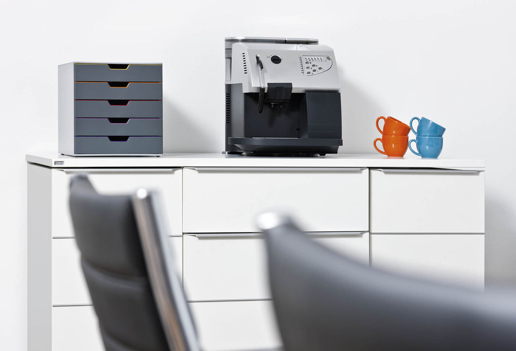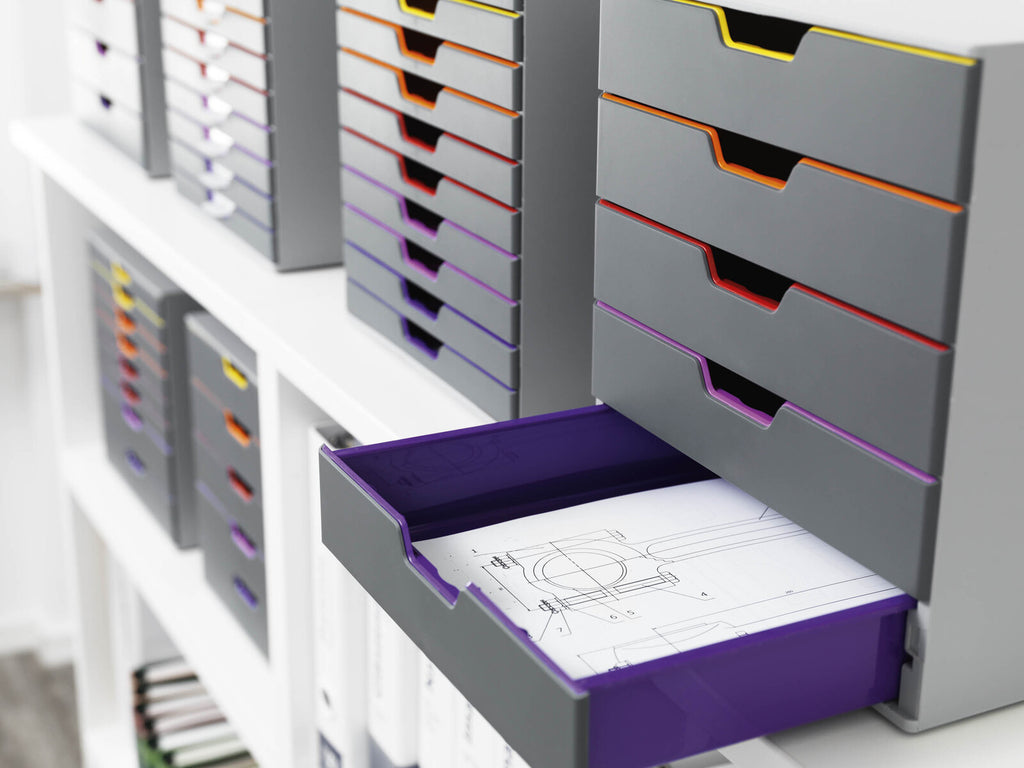 Drawer box with coloured drawers. Fine colour lines serve as organisation and orientation aids. For up to A4, C4 and for folio and letter-size formats. Transparent labelling windows and computer-printable, easily exchangable insert labels included.